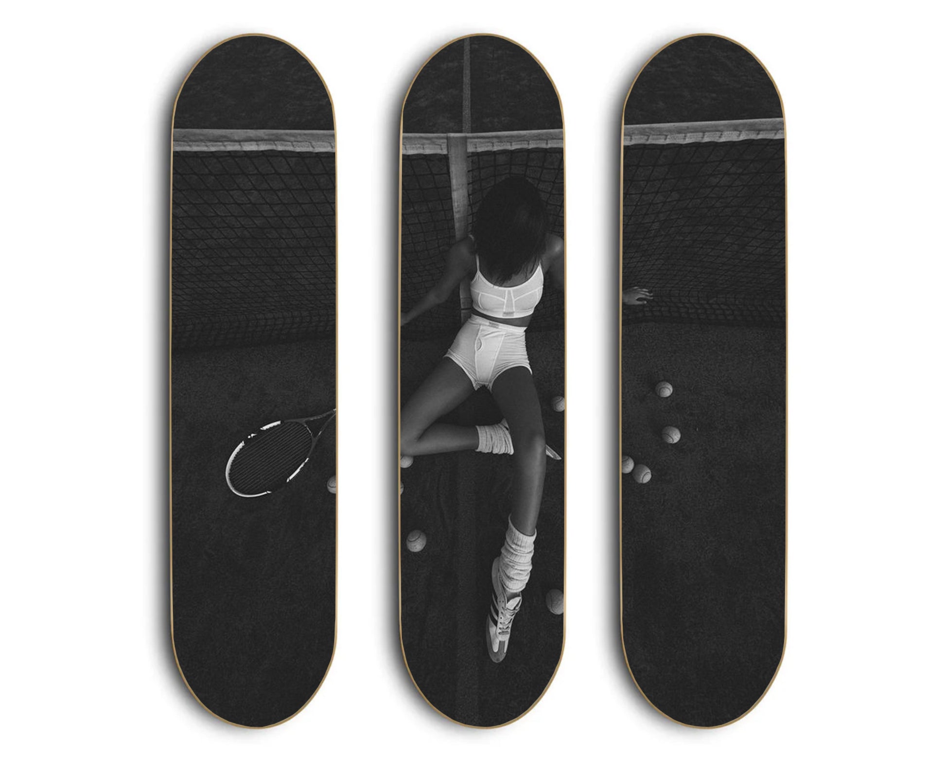 Each set is made to order and handcrafted using wood skateboard decks. While these decks are built from durable, high-quality materials, they are intended for decorative display only — trucks and wheels are not included, and they are not designed for actual skating.